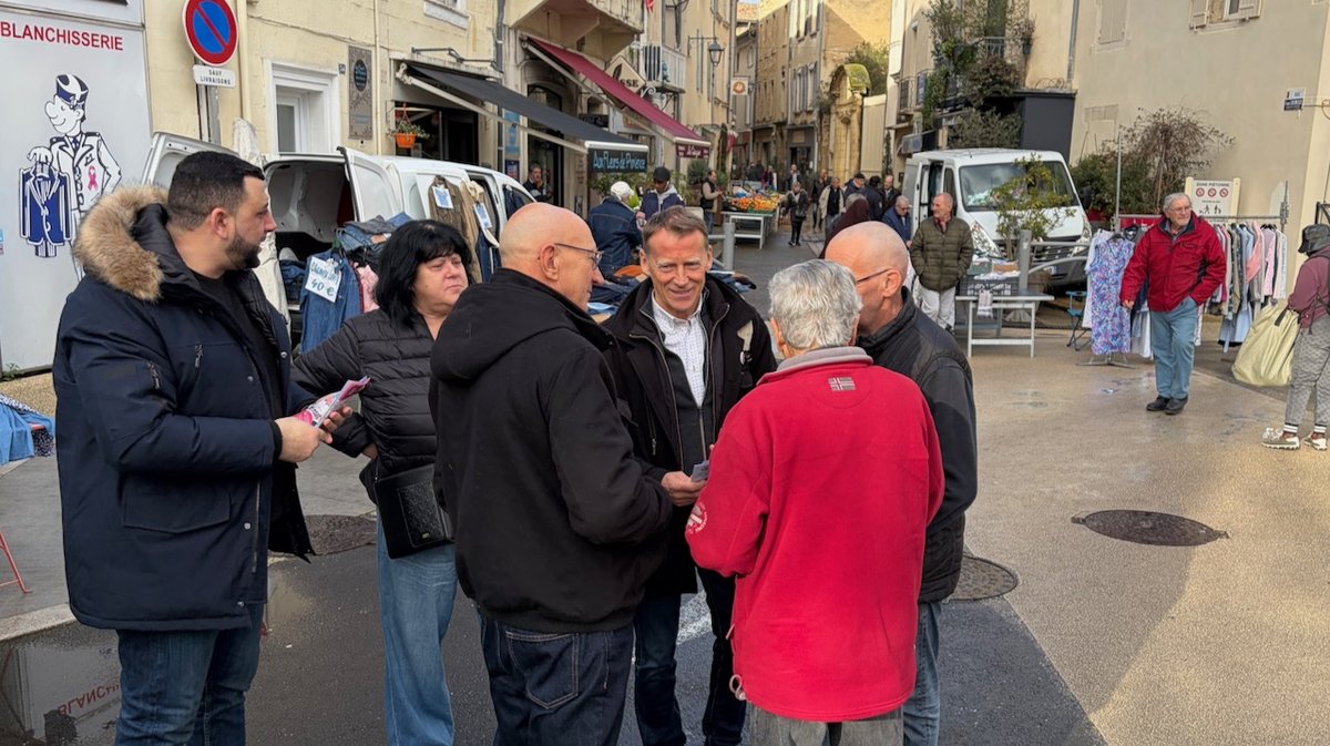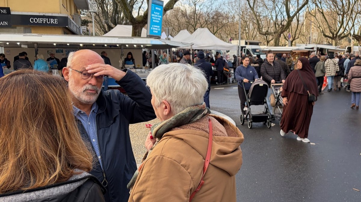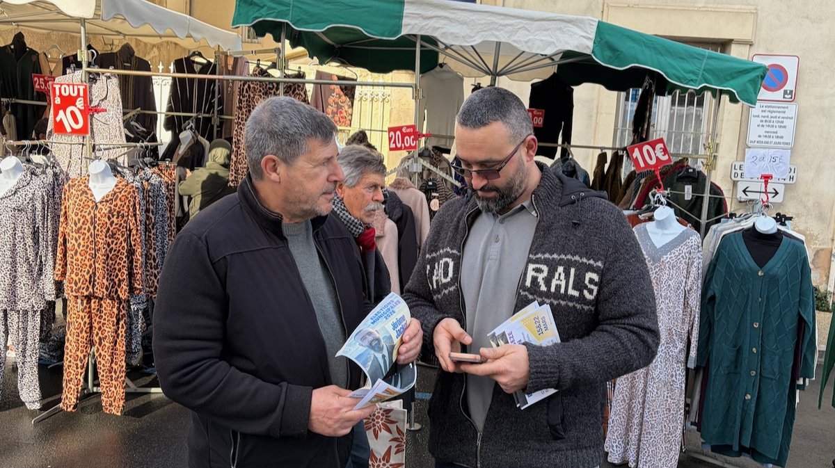 Ce mercredi matin, le soleil se montre pour la première fois depuis des jours, et il y a du monde au marché. Parmi ce monde, les candidats aux municipales et leurs soutiens. On arrive vers 10 heures, en même temps que Philippe Broche et Michel Cegielski, venus rejoindre leurs équipes respectives sur place. Un peu plus loin, on aperçoit le maire sortant Jean-Yves Chapelet en train de discuter avec une administrée, puis deux membres du Rassemblement national munis de quelques tracts, mais pas la candidate Pascale Bordes. Ni le candidat de l'«union des droites » Jean-Marc Touron, du reste. À quelques mètres, Jérôme Jackel taille le bout de gras avec Christophe Prévost.