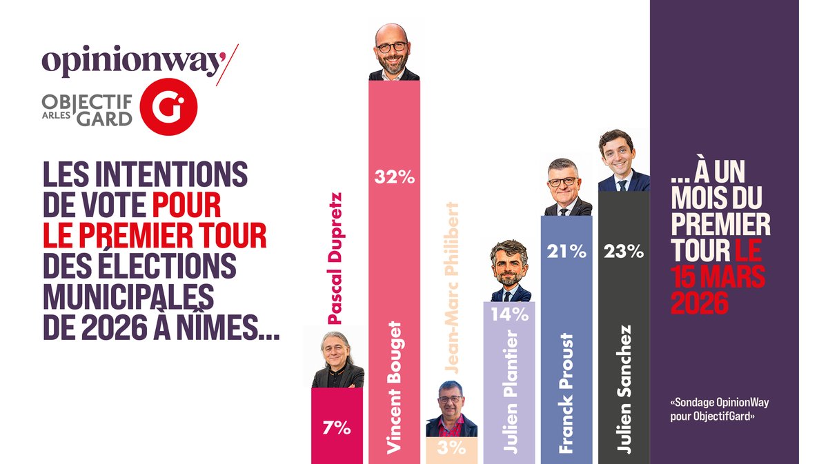 À Nîmes, les prochaines municipales 2026 mettront-elles fin à 25 ans de règne de la droite ? C’est le scénario qui pourrait se dessiner, selon notre sondage Opinion Way, réalisé à un mois des municipales. Cette étude, rappelons-le, ne préjuge en rien des résultats des 15 et 22 mars. Il s’agit d’une photographie de la situation politique actuelle. Alors qu’apprend-on ? Au premier tour, la tête de liste de la gauche unie (hors LFI) Vincent Bouget fait la course en tête. Et de loin, avec 32 % ! L’opposant à la majorité Fournier creuse l’écart avec l’ensemble de ses adversaires. Une performance pour l’enseignant d’histoire-géo, fruit d’un travail de longue haleine.
