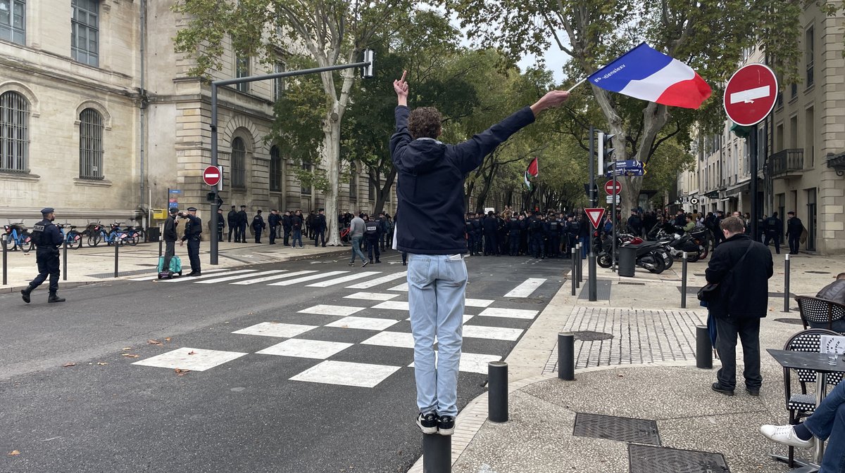 Puis, vers 14h30, la tension est montée quand des opposants à la venue de Jordan Bardella se sont approchés du lieu de la dédicace. Séparés par un imposant dispositif de forces de l'ordre, les deux camps se sont affrontés, mais pas physiquement. En revanche les noms d’oiseaux ont fusé. Aux chants anti-RN des uns les autres répondaient par la Marseillaise. Un drapeau palestinien d’un côté et des drapeaux tricolores de l’autre. Le temps d’un après-midi, Nîmes est sortie de sa torpeur dominicale pour être le théâtre de l’opposition entre deux France que rien ne semble pouvoir réconcilier.